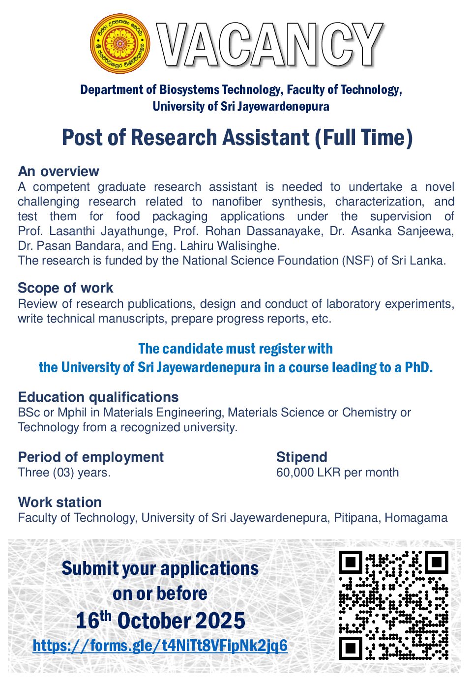 Post of Research Assistant-Department of Biosystems Technology, Faculty of Technology