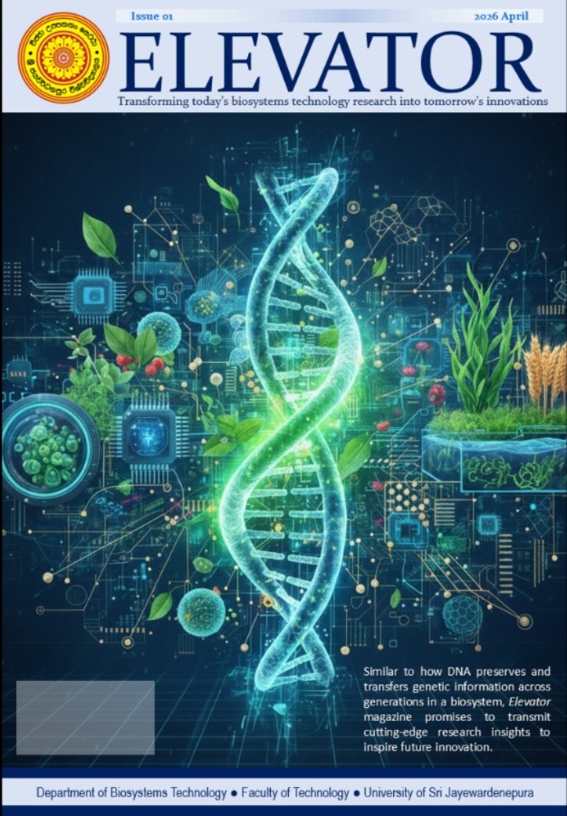 ELEVATOR is a research and innovation magazine published by the Department of Biosystems Technology at the Faculty of Technology, University of Sri Jayewardenepura in Sri Lanka. This magazine serves as a platform to bridge the gap between academia and the wider community by showcasing cutting-edge research, emerging industrial trends, and groundbreaking innovations.